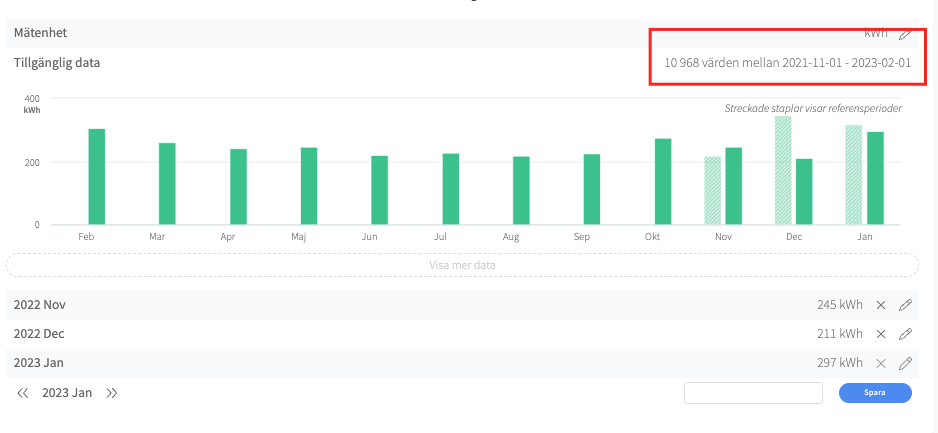 Vi är i mitten av innevarande månad och data skickas och hämtas endast en gång per månad. För timvärden så släpar importen med 1 dygn.