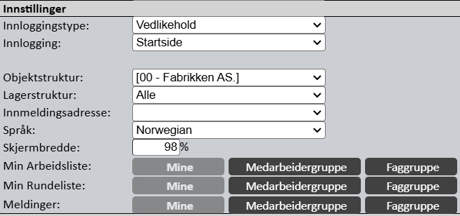 Innlogging: Denne er som standard satt til ‘Min Arbeidsliste’. Startsiden er den siden man kommer først inn på etter pålogging. Brukeren har her selv tilgang til å velge ønsket startside.