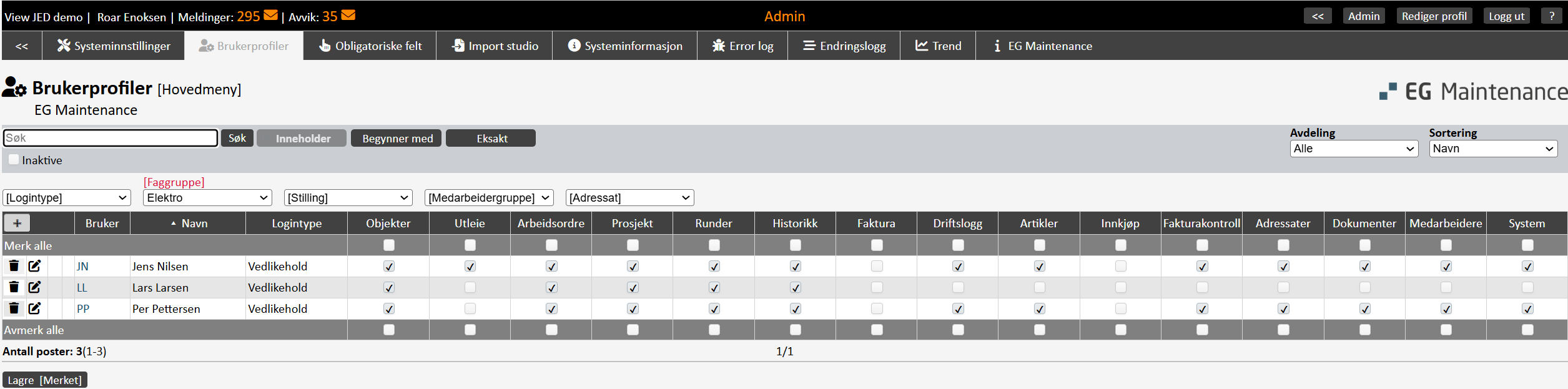 Her kan det settes opp hvilke menyer brukeren skal kunne se i hovedmenyen. Det kan med fordel gjøres endringer her for å forenkle oversikten for spesifikke brukere. For tilganger i de forskjellige menyene, ref. egen omtale under ‘Brukerprofiler' → 'Tilganger’.