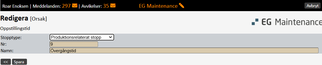 Stopporsaken registreras med fritt valt nummer, beskrivande namn och eventuellt kopplat till stopptyp.