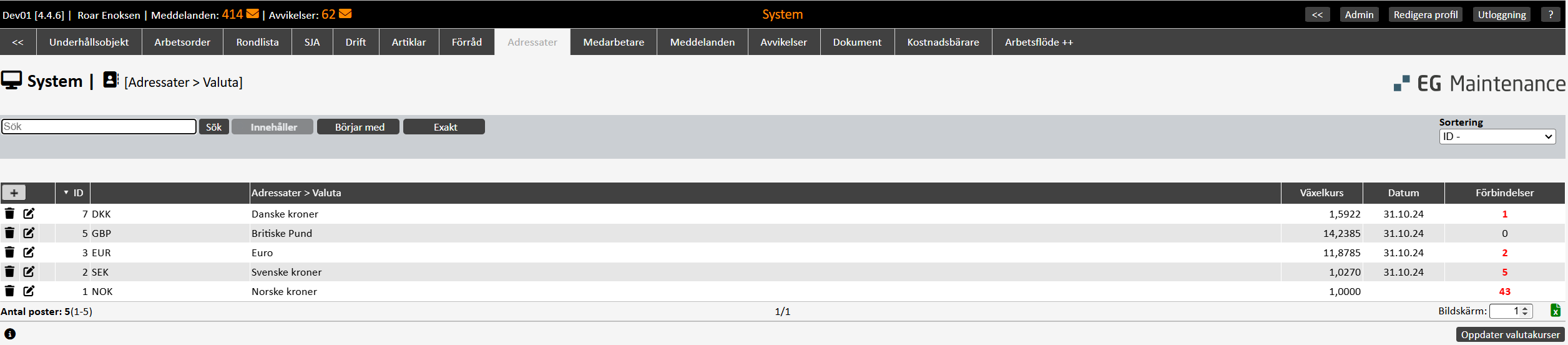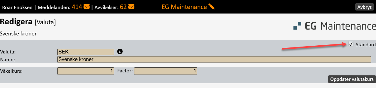 Observera: Uppdatera växelkursknappen eller funktionen för automatisk uppdatering av växelkurser kan inte användas om du kör Maintenance med en annan standardvaluta än SEK (eller NOK). Då måste du uppdatera valutorna manuellt.