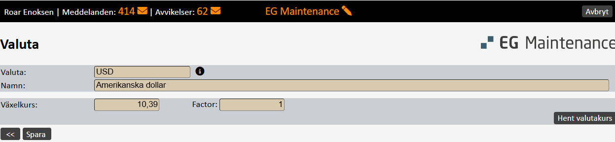 När du skapar en ny valuta anger du korrekt valutakod, ett namn på valutan och trycker på 'Hämta växelkurs' (Hent valutakurs). Kursen kommer nu att hämtas från Riksbanken. Observera: Denna knapp kan inte användas om du kör Maintenance med en annan standardvaluta än SEK (eller NOK). Då måste du uppdatera valutorna manuellt. Valuta infogas med valutakod, ett namn, växelkurs och en faktor beroende på hur växelkursen anges. Exempel för dollar (1$ = 10,39 SEK) sätt upp med SEK som standardvaluta.
