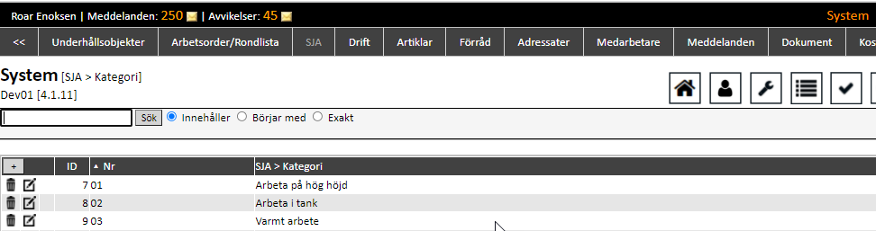 En kategori kan helt enkelt vara en kategorisering av de olika arbetstyperna som innehåller faror som ska bedömas i samband med åtgärder, risk och sannolikhet. En kategori består av ett prefix som man väljer själv och ett beskrivande namn.
