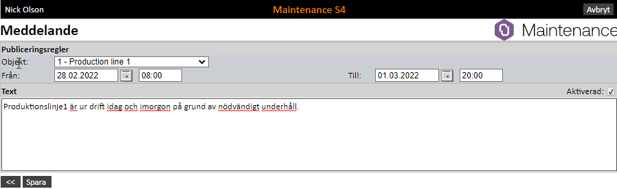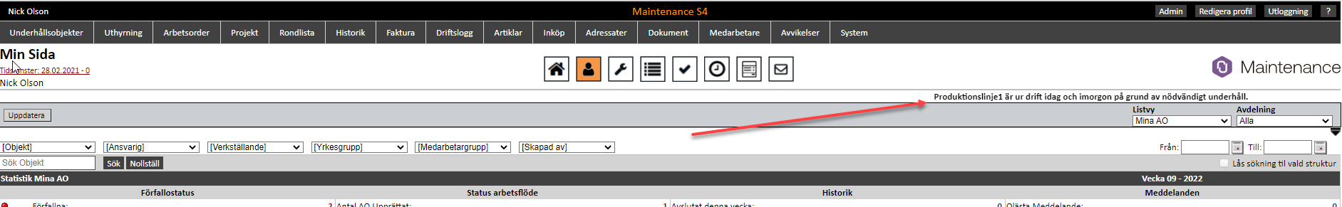 Man kan skapa driftmeddelanden (banner) som kommer rulla över skärmen i systemet och visas för alla inloggade användare.