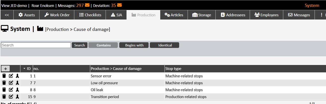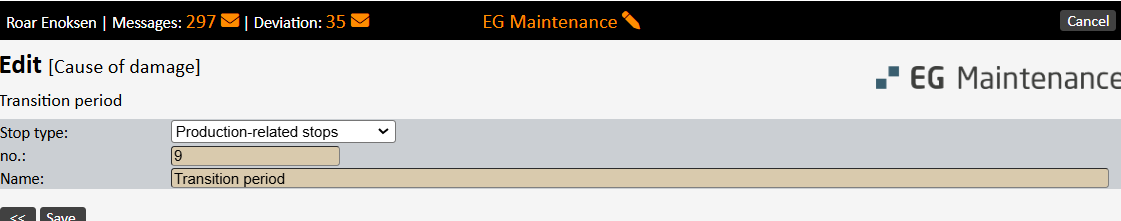 Causes of damage are registered with a freely selected number, a descriptive name and possibly connected to a stop type.