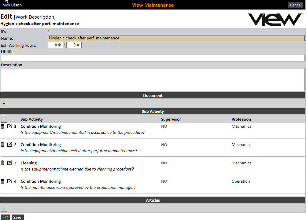Default work descriptions with separate fields for Utilities and Description can be created here. After saving, you can also link sub-activities (checkpoints), parts lists (articles) and documents. For details regarding the creation of sub-activities, adding articles and documents, see separate description under work orders, since this is the same procedure.