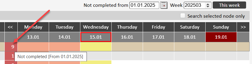 Weekly view for checkpoint status, ie executed (blue) and non-executed points (red). You can also, among other things, filtering on a checklist (head).
