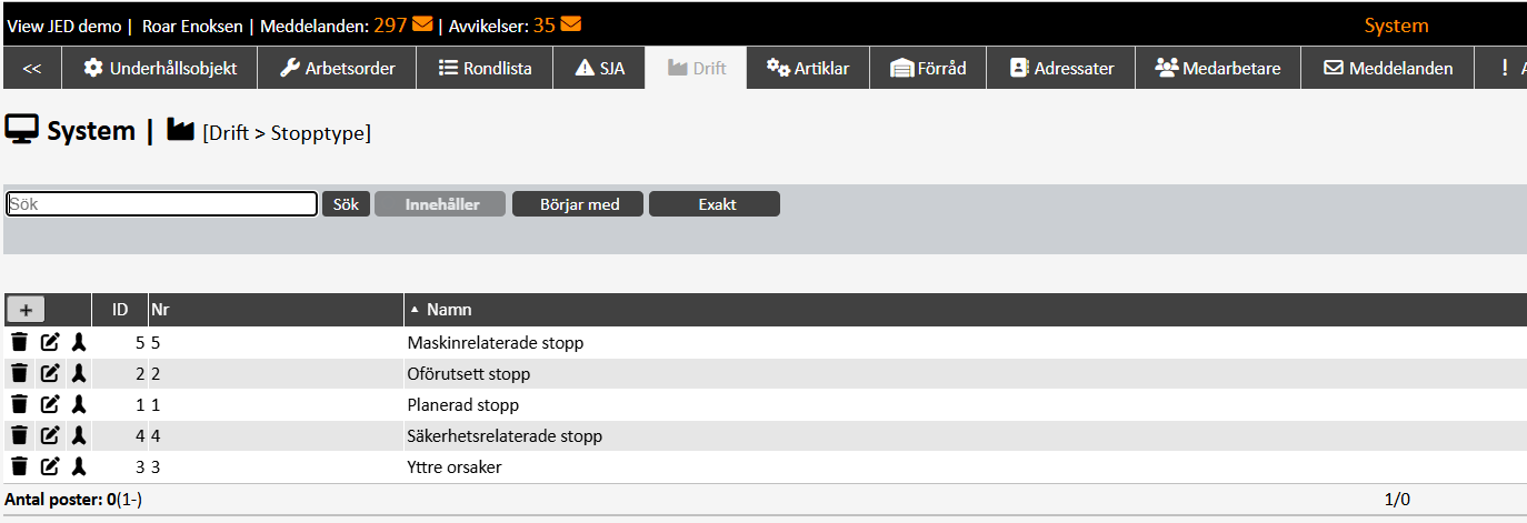 Stopptyp kan definieras i driftssloggen. Befintliga stopporsaker kan kopplas till stopptyp.
