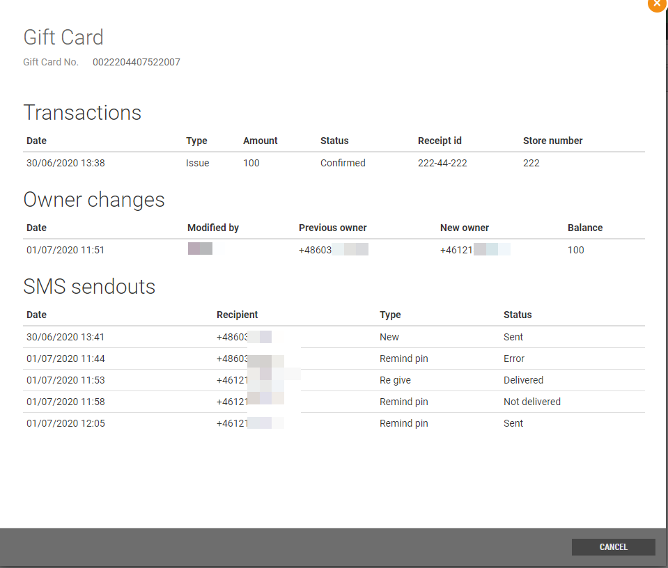 The existing functionality for reminding the customer of their PIN code has been reimplemented to use GiftCardService. All distributions of gift cards are displayed in the details of gift card in Chain Web, when clicking the “eye” icon. When a new gift card is purchased, it is required to be registered with a valid phone number, as the PIN code will be sent by SMS to the owner. Additionally, it is possible to give a gift card away to another owner, for example as a birthday present. When giving away a gift card it is important that the new owner’s phone number is registered on the gift card when giving it away, so that they will receive the PIN code on SMS. Changing the owner of a gift card can be done through the GiftcardService API in a 3rd party application or in Chain Web.