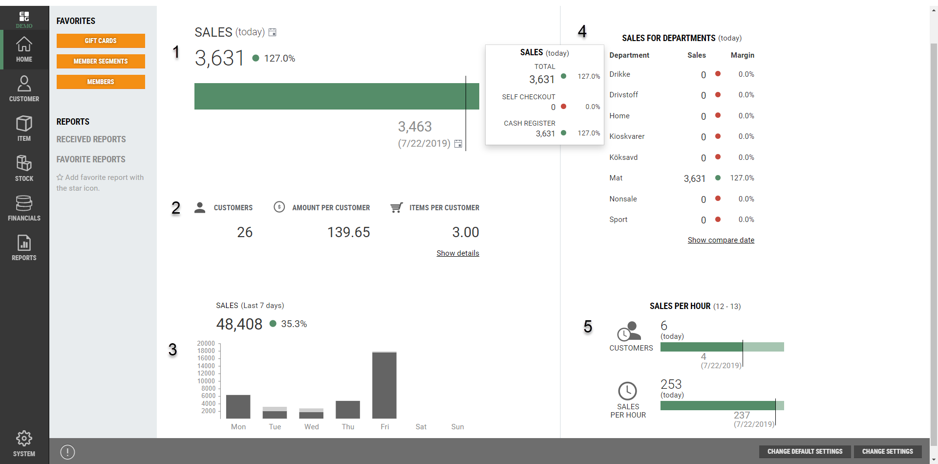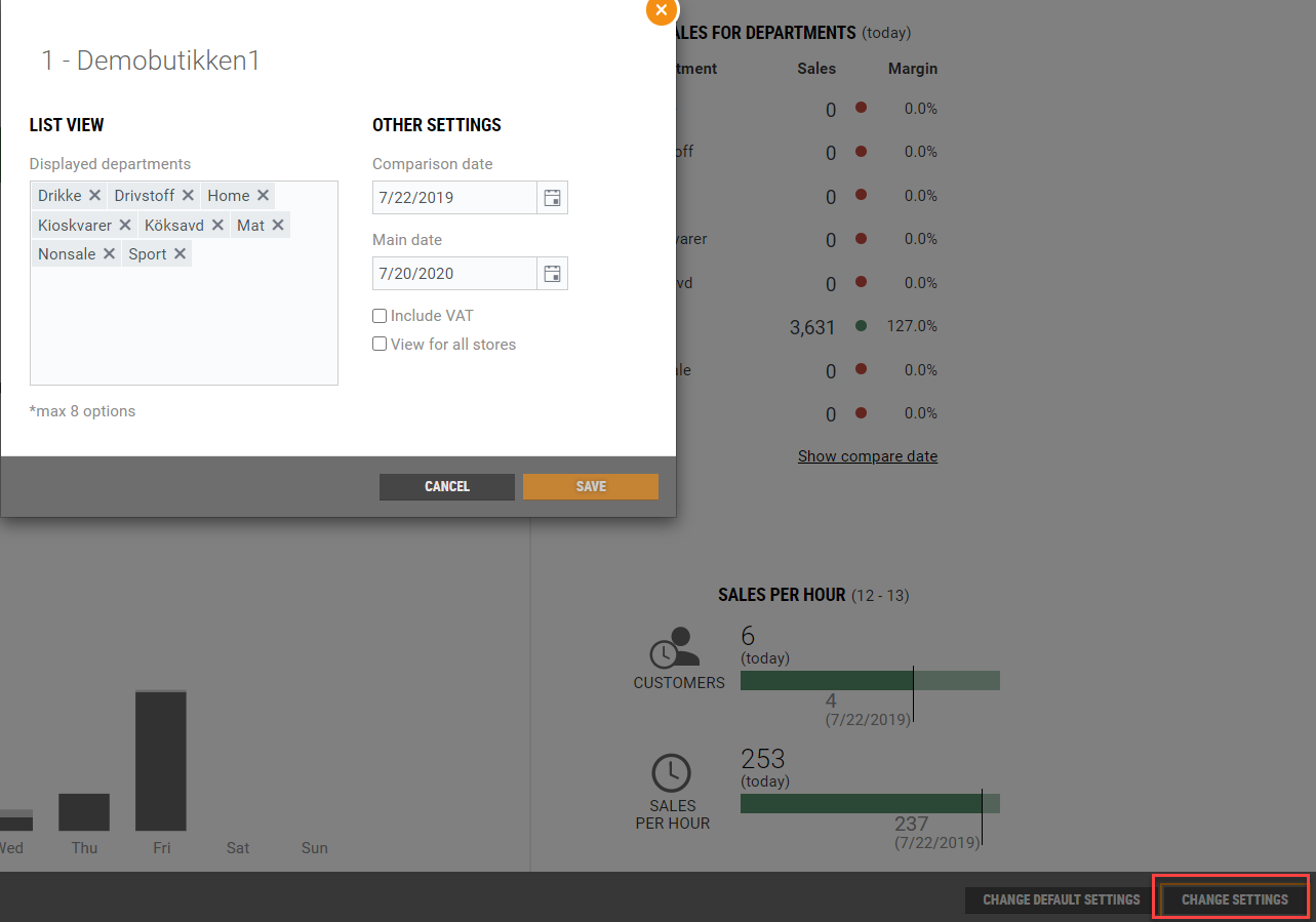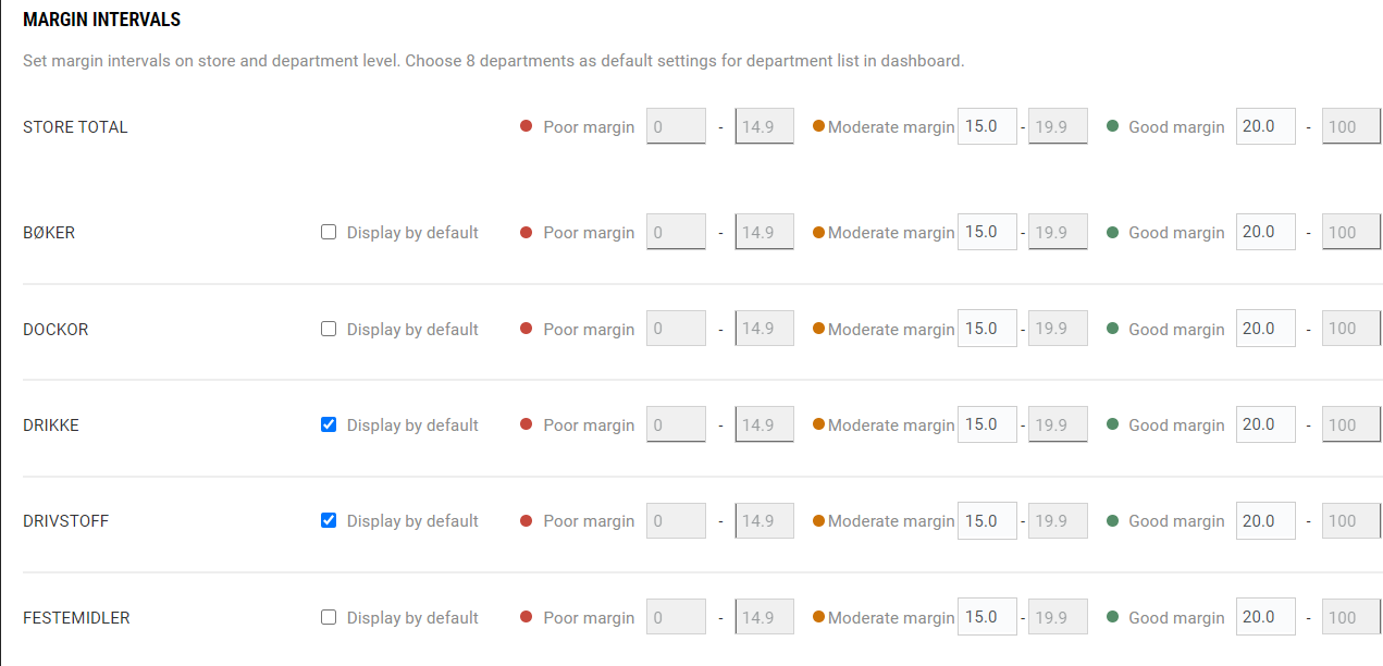 Sales for Departments. This section shows sales per department. In the default settings (HQ user access) it is possible to adjust the margins and to decide which departments should be shown by default for all users. Individual users can adjust which departments should be shown for them.
