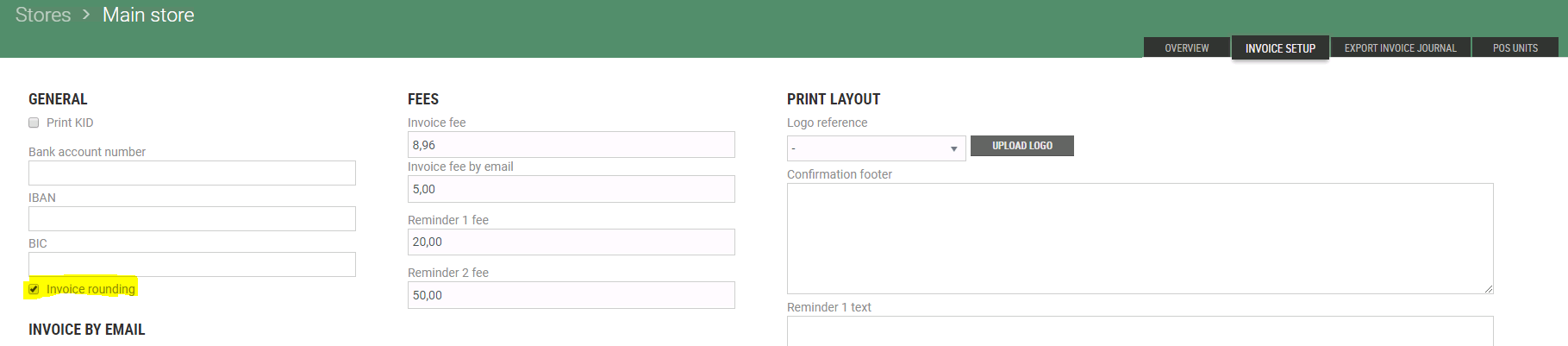The invoice rounding is decided for each store individually. Invoice rounding is activated by ticking the checkbox in store configuration (System → Stores), in the tab: 'Invoice setup'.