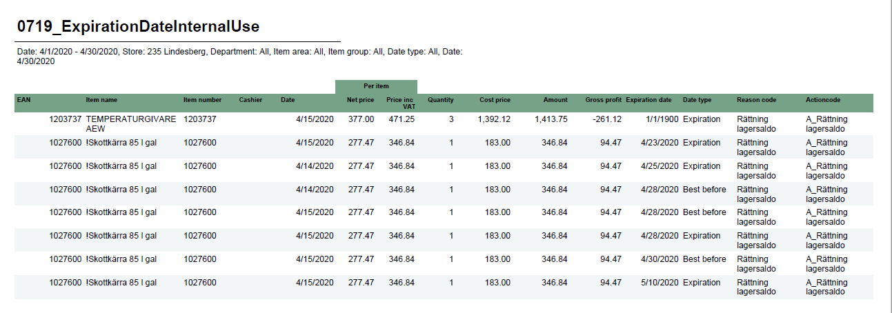 To help retail chains keep control of items with expiration dates used in internal transfers, report 0719_ExpirationDateInternalUse is created.