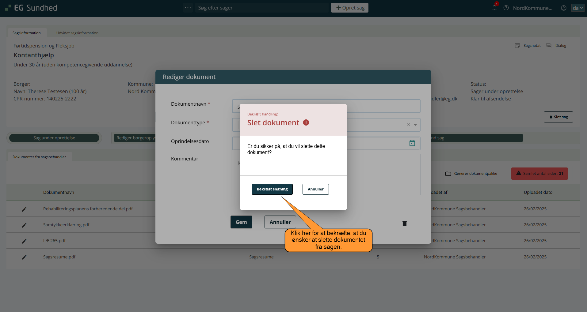 -ikonet nederst i popup-vinduet. Du vil blive mødt af et nyt popup-vindue, hvor du skal bekræfte, at du ønsker at slette dokumentet: - Klik på Bekræft sletning. Vær opmærksom på, at det ikke er muligt at slette dokumenter, der er obligatoriske på sagen.