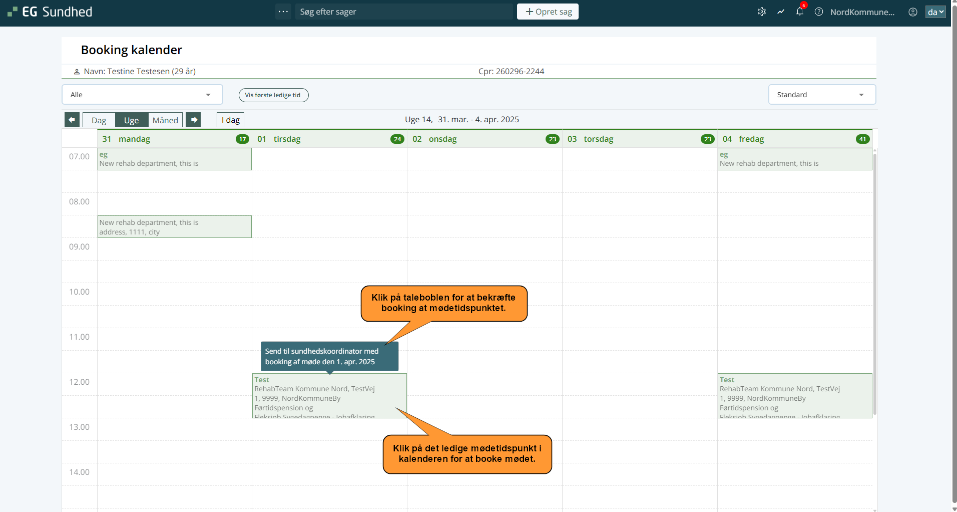 3. Find en ledig dag og tidspunkt i kalenderen, hvor du kan booke et møde til sagen, og klik på det i kalenderen.