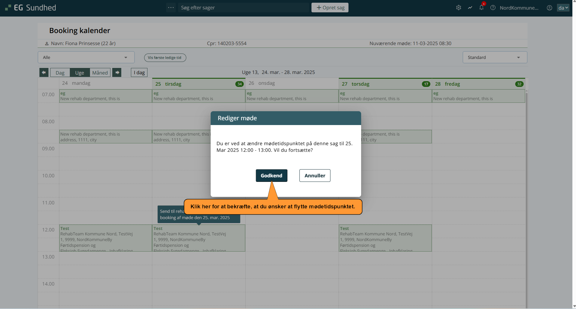 - Klik på Godkend for at bekræfte, at du ønsker at flytte mødet til den valgte dato.