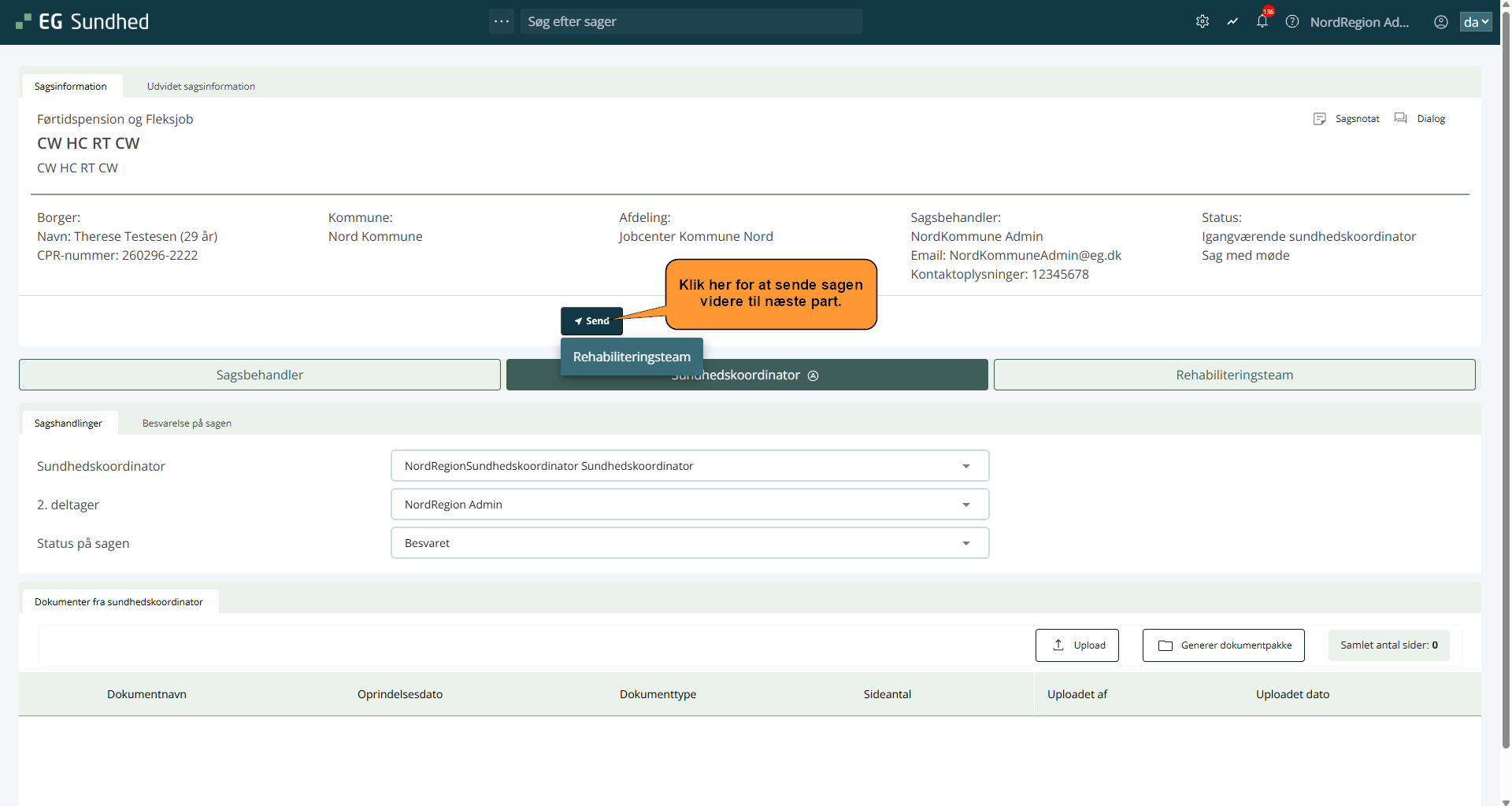 4. Når status på sagen er sat til besvaret, kan du nu sende sagen videre til næste part. Det gør du ved at trykke på Send i boksen under Sagsinformation. Der popper en boble op, hvor der står hvilken part, du sender sagen videre til. Tryk på parten for at bekræfte.