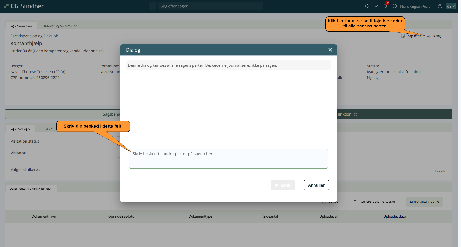 Vær opmærksom på, at alle beskeder mellem sagens parter vil blive journaliseret.