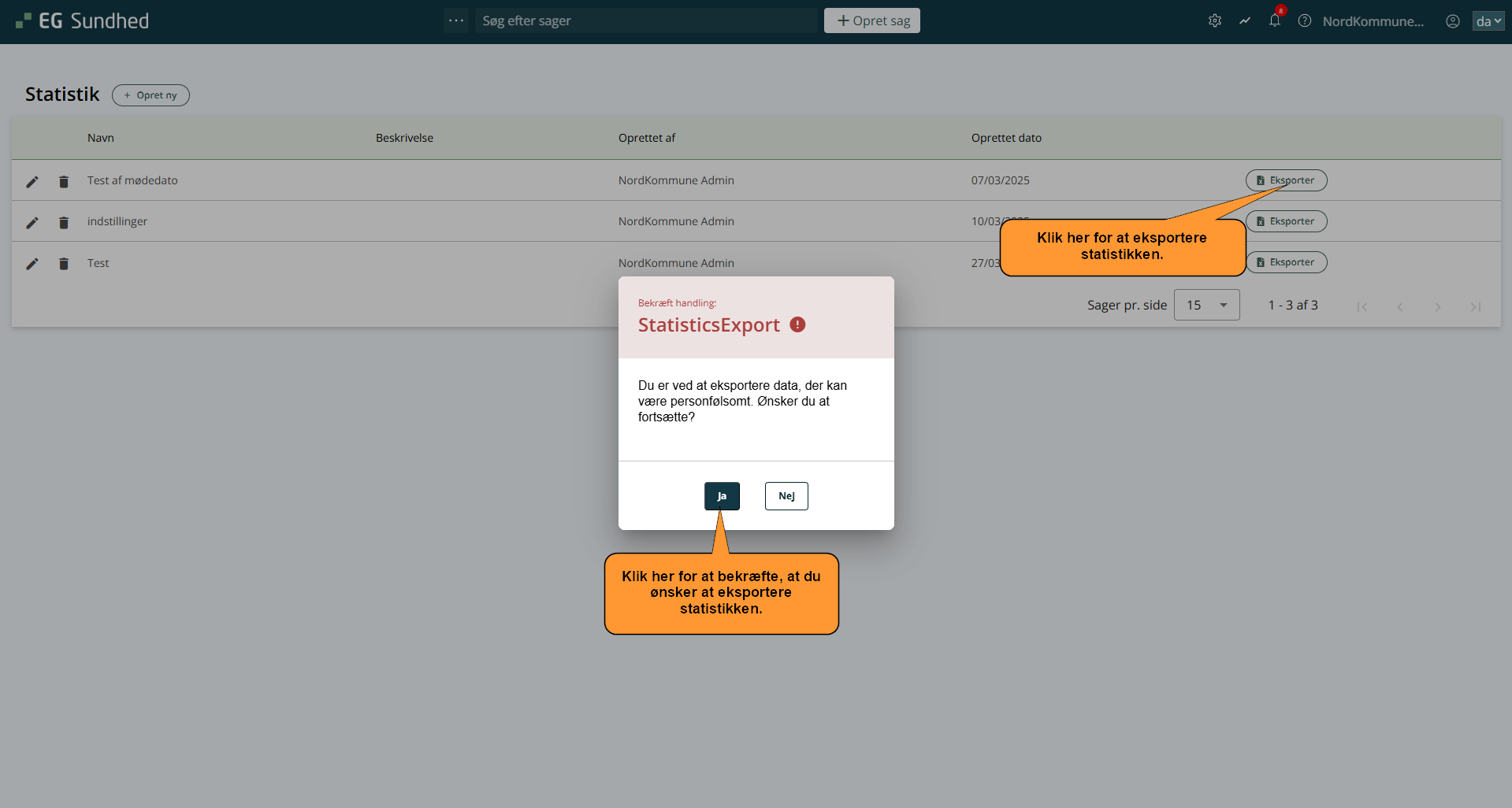 - Tryk på Eksporter ud for den statistik, du ønsker at downloade. Et popup-vindue åbner: