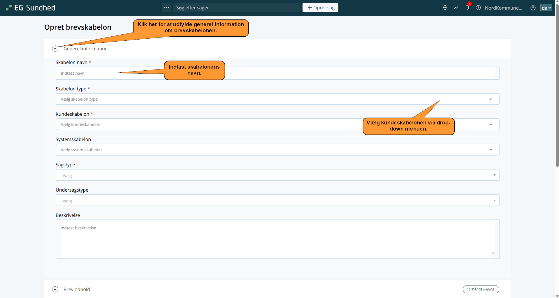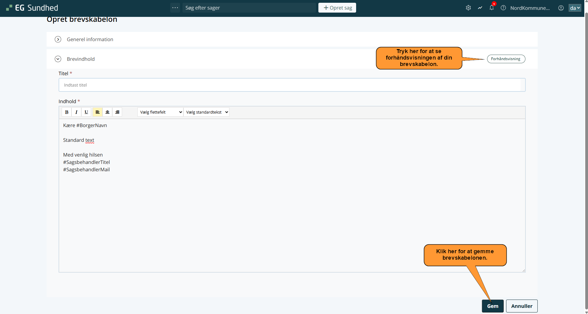 - Hvis du ønsker at se brevskabelonens opsætning, inden den gemmes, skal du trykke på Forhåndsvisning ud for Brevindhold.