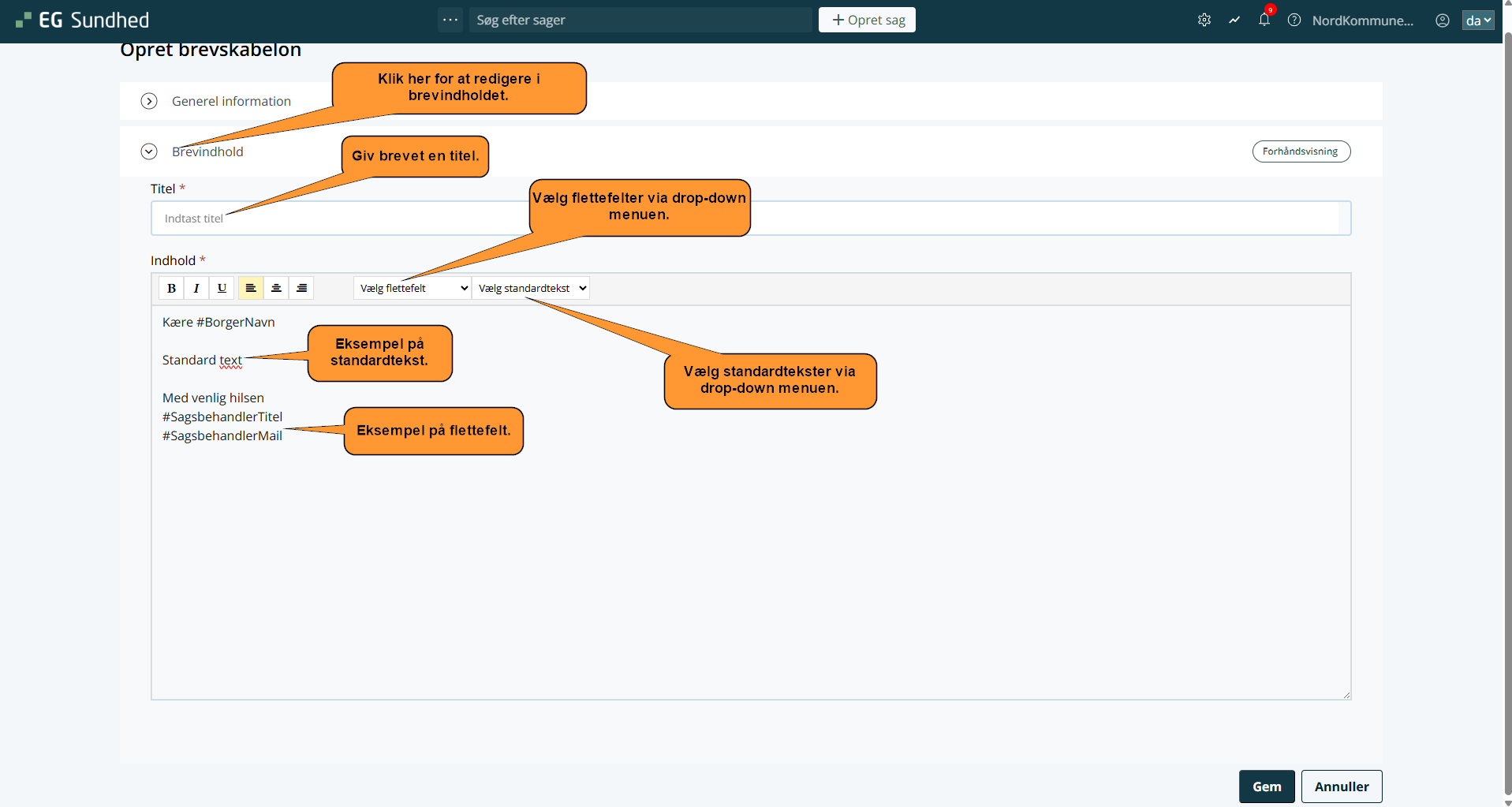 - Hvis du vælger en af mulighederne i Systemskabelon via drop-down menuen, bliver der genereret en brevskabelon til dig på forhånd. Her er et eksempel: