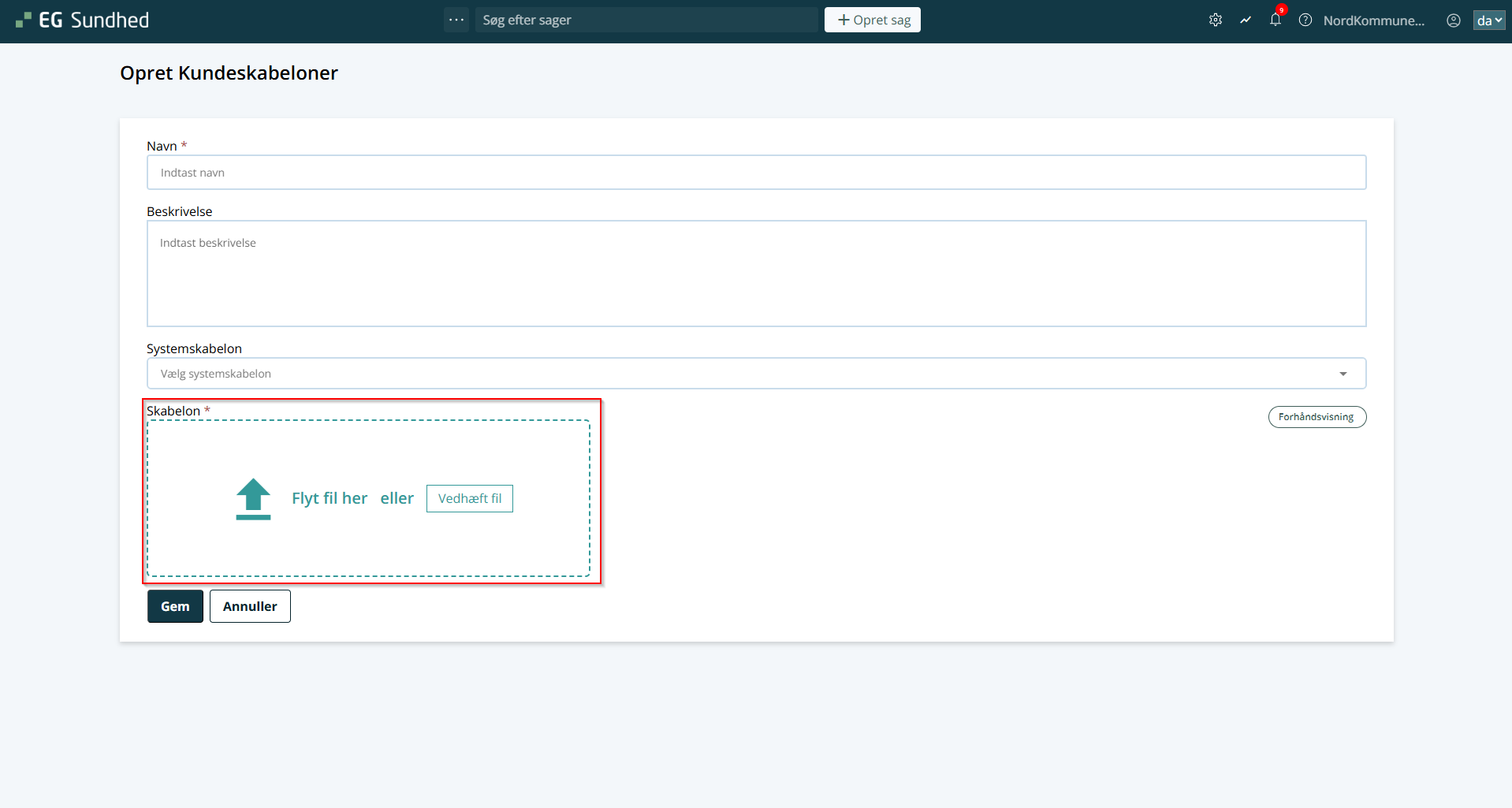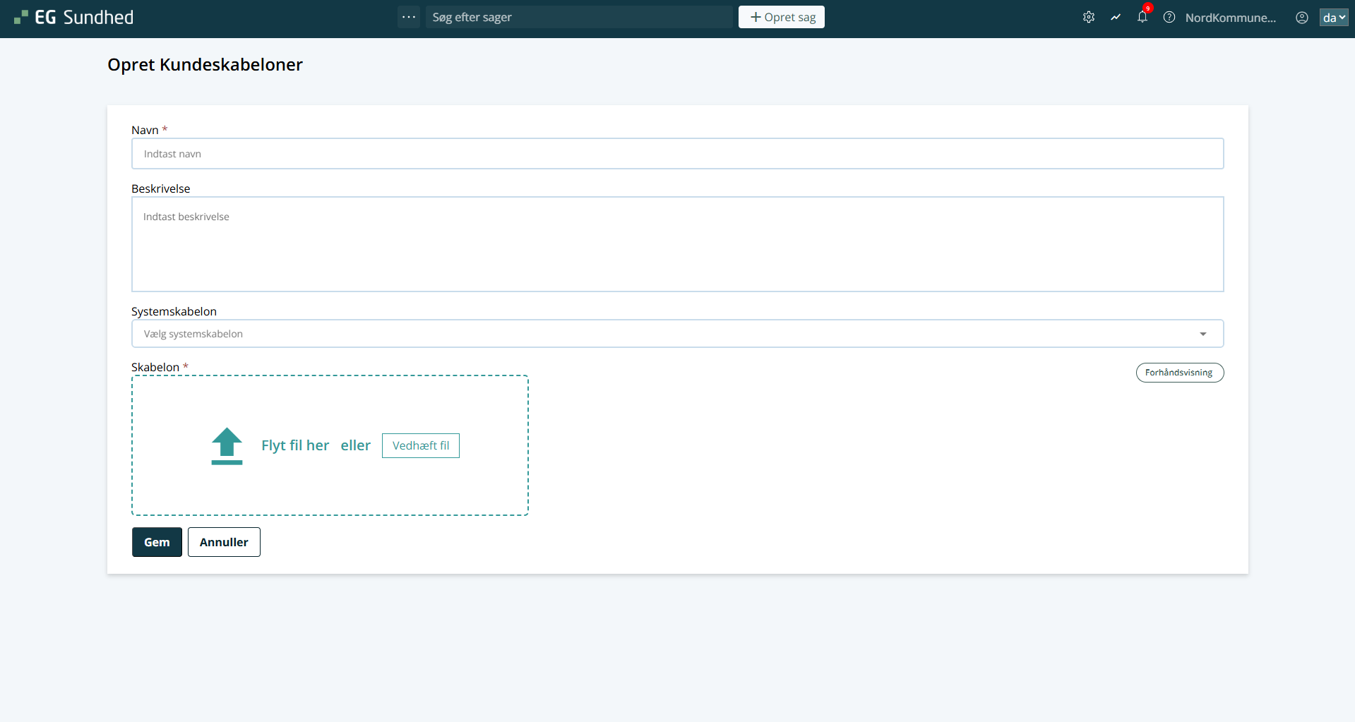 • Du kan vælge en systemskabelon via en drop-down menu, men dette er ikke obligatorisk. Hvis du udfylder dette felt, vil du få en skabelon, som i forvejen ligger i systemet.