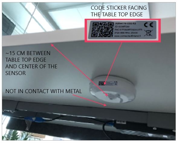 - Kiinnitä liikesensori kiinnityslevyyn. Liikesensorin antenni sijaitsee QR-kooditarran alapuolella. Sijoita anturi aina niin, että antenni osoittaa pöydän etuosaa kohti eikä ole suoraan metallia kohti.